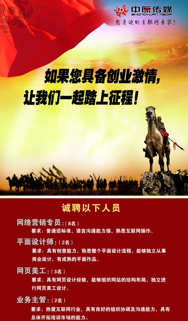 應(yīng)聘須知:中原傳媒要求應(yīng)聘者要具有挑戰(zhàn)的精神,具有創(chuàng)業(yè)的激情,認(rèn)同公司的發(fā)展,能與公司長期的一起發(fā)展下去。意向者請發(fā)簡歷至公司信箱zkzycm@163.com,或者直接電話聯(lián)系13939438668